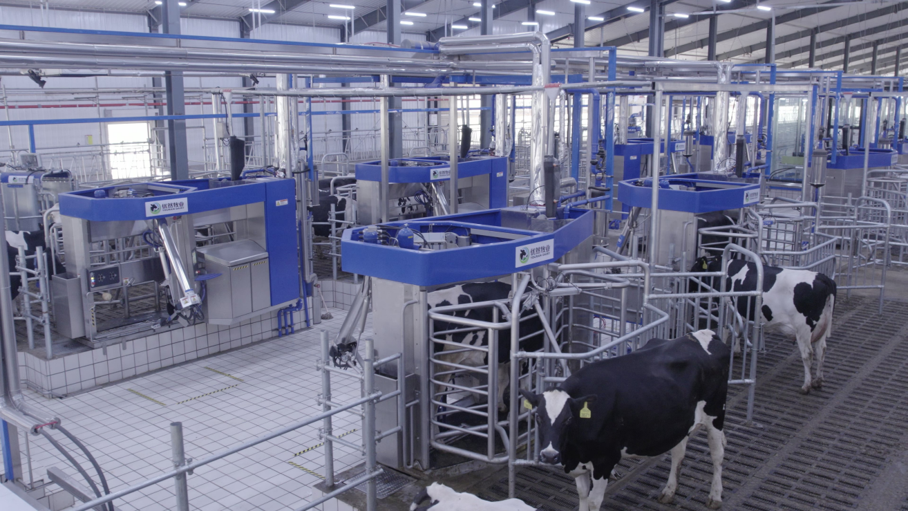 建成了全自動化的“無人牛舍”,引入了全智能無人擠奶機器人、飼喂機器人、推料機器人、清糞機器人、全天候奶牛飼喂TMR配料系統以及智能機器人生物發酵糞肥處理系統,新開發AI噴淋系統、機器人藥浴系統等,提高奶牛舒適度、健康度的同時有效降低了成本和碳排放,並應用自主研發的“慧牧雲”智慧牧場管理系統並與物聯網“雲”技術聯動,實現牛舍溫濕度、光照度、空氣新鮮度等環境變數的自動調節,引領行業步入“無人化養牛”時代。