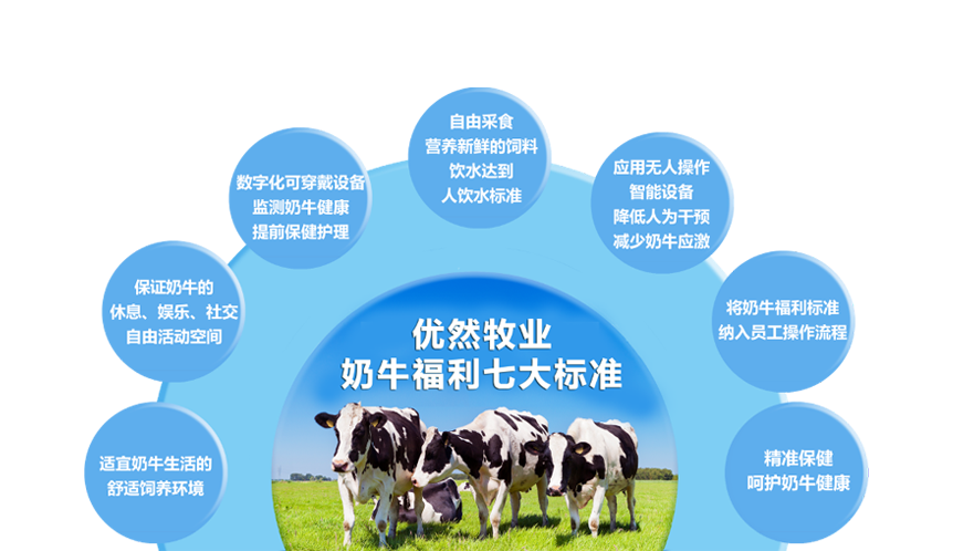 建立“適宜奶牛生活的舒適飼養環境”、“保證奶牛的休息、娛樂、社交、自由活動空間”、“數位化可穿戴設備監測奶牛健康,提前保健護理”、“自由采食營養、新鮮的飼料;飲水到達人飲水標準”、“應用無人智能設備,減少奶牛應激”、“將奶牛福利標準納入員工養殖理念和操作流程”以及“精准保健,呵護奶牛健康”七大標準,使奶牛在福利環境中健康、愉悅地生活、生產。